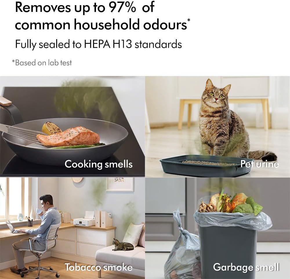 360° HEPA H13 Filter: 9 metres of borosilicate microfibres, pleated over 200 times, capture 99.95% of pollutants as small as 0.1 microns.