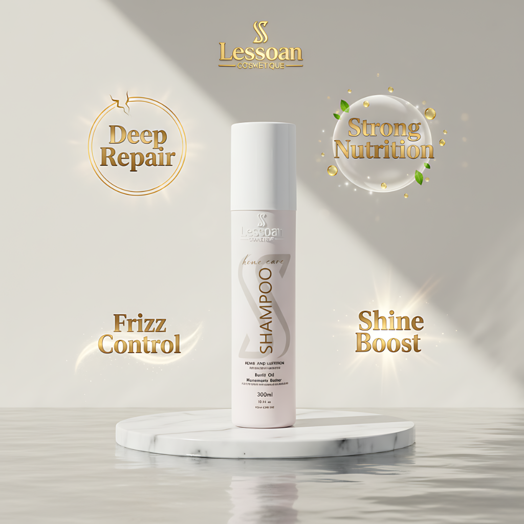 To use, wet hair thoroughly with warm water, apply a small amount of shampoo to the scalp, and massage gently in circular motions. Rinse completely, allowing the foam to cleanse the lengths and ends. Repeat if necessary for deeper cleansing. The shampoo is suitable for daily use and works effectively alongside Lessoan smoothing treatments.