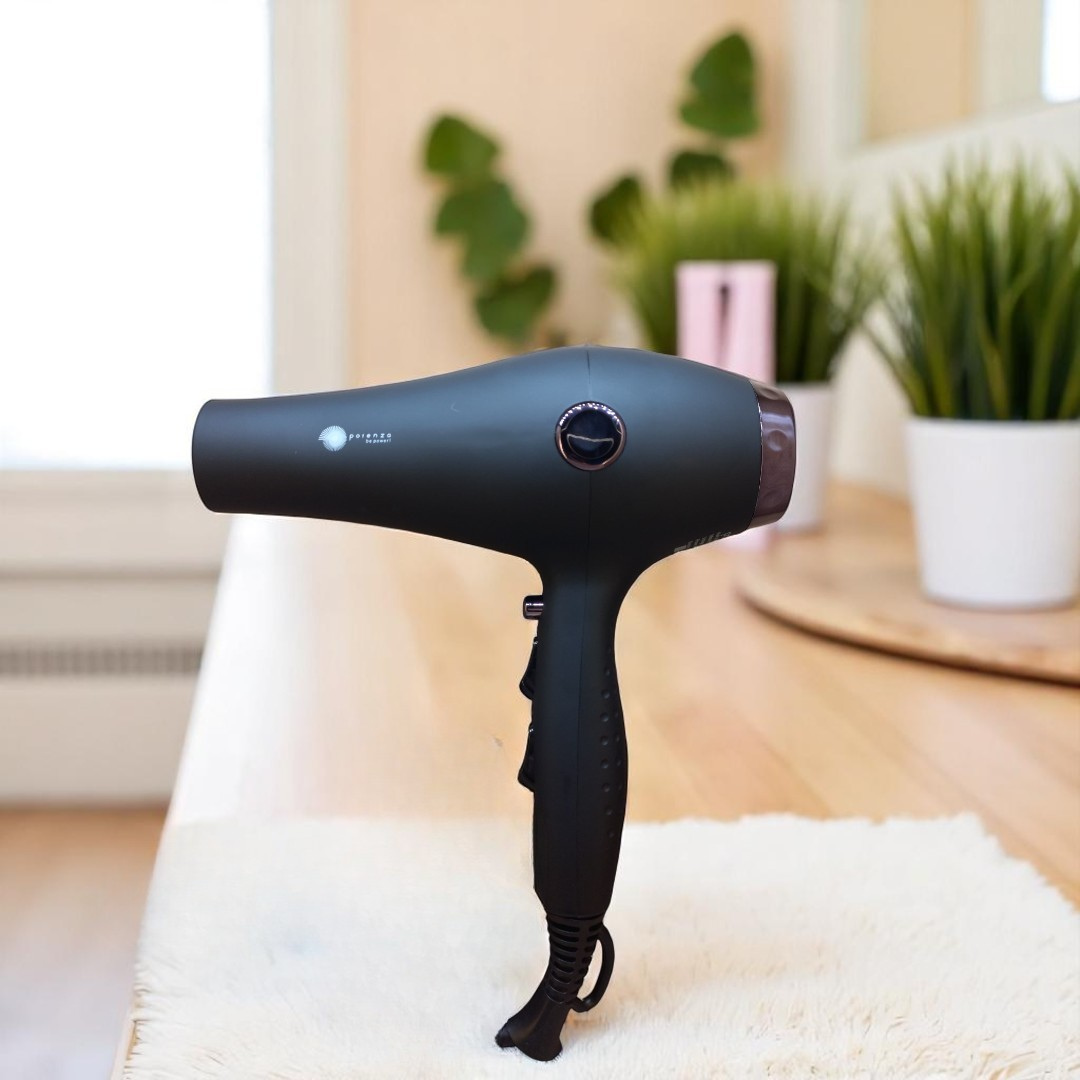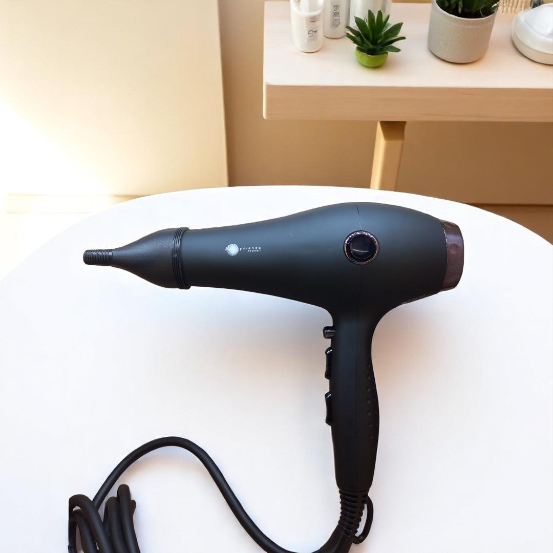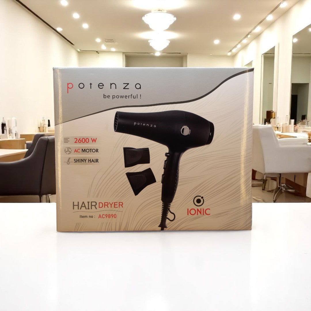 The Potenza AC9890 Professional Hair Dryer is equipped with a 2600W AC motor that provides strong airflow for efficient drying. It features ionic technology designed to help reduce static and smooth the hair surface. The dryer includes two concentrator nozzles for controlled styling and has a lightweight, ergonomic design suitable for both professional and home use. It is intended for all hair types and offers durable performance for everyday styling needs.
